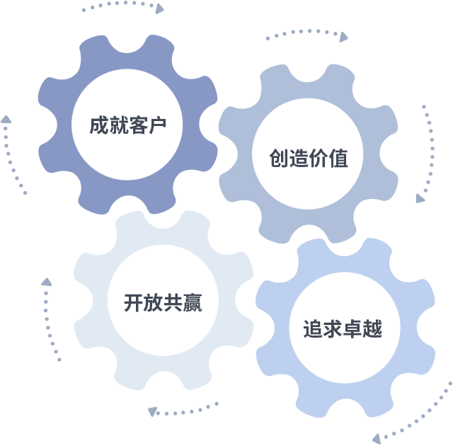 成就客户是一切决策的出发点,,,,创造价值是衡量所有工作的标准,,,,追求卓越是我们做事做人的态度,,,,开放共赢是我们的格局也是最终的结果。。。。价值观的齿轮环环相扣,,,,推动着组织里的每个人不断向前。。。。